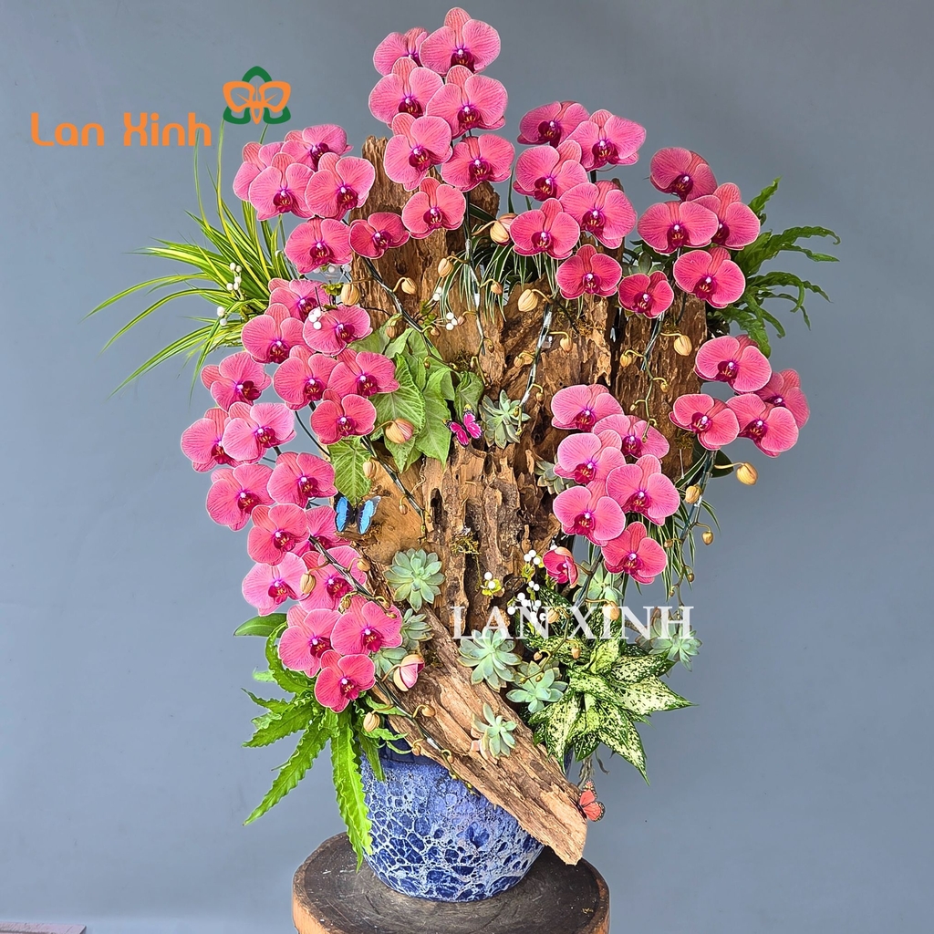 Mẫu chậu hoa lan hồ điệp cam đỏ ghép gỗ lũa