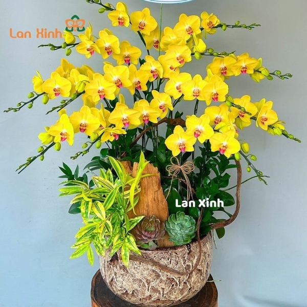 Với sắc vàng rực rỡ, chậu lan hồ điệp màu vàng 12 cành toát lên vẻ quý phái tượng trưng cho phú quý và sung túc. Khi kết hợp với chi tiết sen đá và gỗ lũa, chậu lan hồ điệp màu vàng 12 cành trở nên đẹp mắt, hòa giữa vẻ đẹp của tự nhiên và nét tinh tế trong nghệ thuật sắp đặt, phù hợp với những không gian sang trọng, cần sự thư thái.