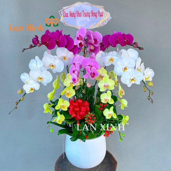 Trong phong thủy, lan hồ điệp không chỉ là loài hoa biểu tượng của sự cao quý, mà còn mang ý nghĩa về tài lộc và thịnh vượng. Chậu lan hồ điệp tặng khai trương tượng trưng cho sự phát tài, phát lộc, giúp gia chủ kinh doanh thuận lợi, gặp nhiều may mắn và thành công. Sự kết hợp của nhiều màu sắc cũng đại diện cho sự hòa hợp, phát triển bền vững trong công việc và cuộc sống.