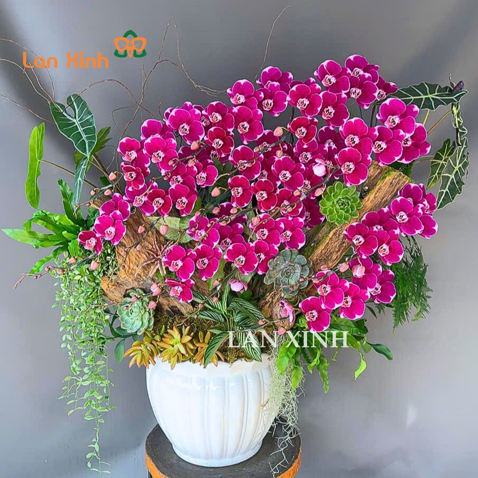 Mẫu chậu hoa lan hồ điệp tím đột biến ghép tiểu cảnh